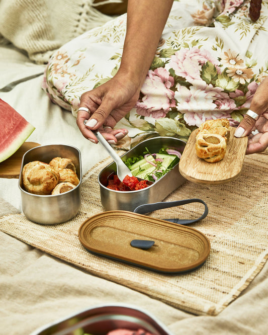 Normaler Preis €39,95Normaler PreisGrundpreis / proVerkaufspreis €39,95Eine Lunchbox aus Edelstahl mit einem Deckel aus Bambus, der auch als Schneidebrett verwendet werden kann