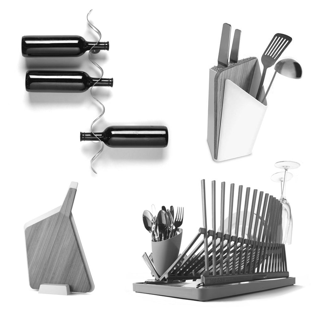 Wir haben auch Entwürfe für die Küche mit innovativen, platzsparenden Produkten wie dem flach zusammenklappbaren Geschirrkorb "High & Dry", dem wandmontierten Weinregal "Flow" und dem Messer- und Utensilienhalter "Forminimal" mit Schneidebrett entwickelt.