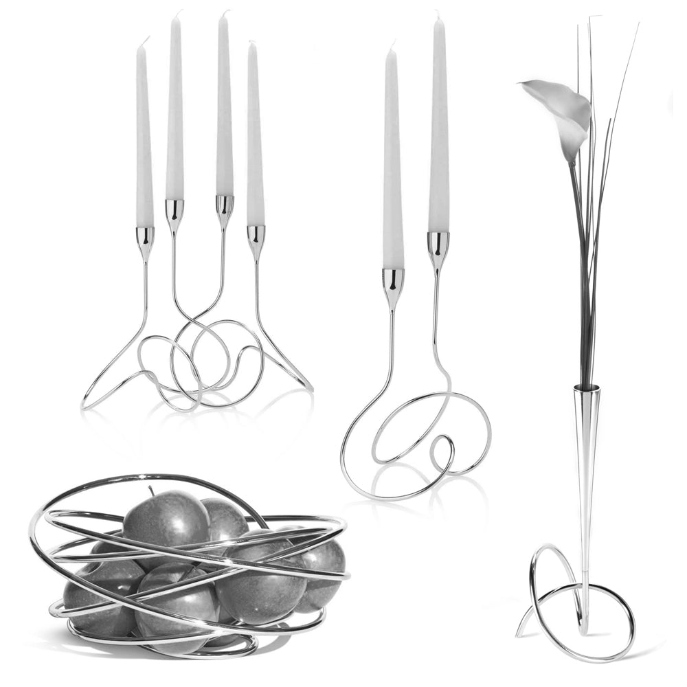 Mit unserer handgeformten "Loop"-Serie haben wir auch viele verschiedene skulpturale Tischgestaltungen wie Kerzenleuchter, Obstschalen und Blumenvasen erforscht.