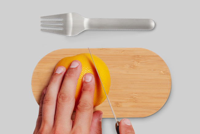 Der antibakterielle Bambusdeckel verdeckt die Gabel und verhindert eine Kreuzkontamination. Er kann auch als Schneidebrett oder Servierplatte verwendet werden.