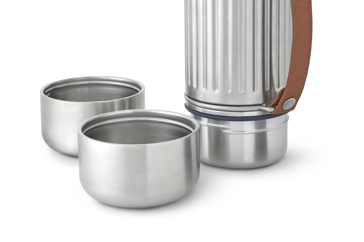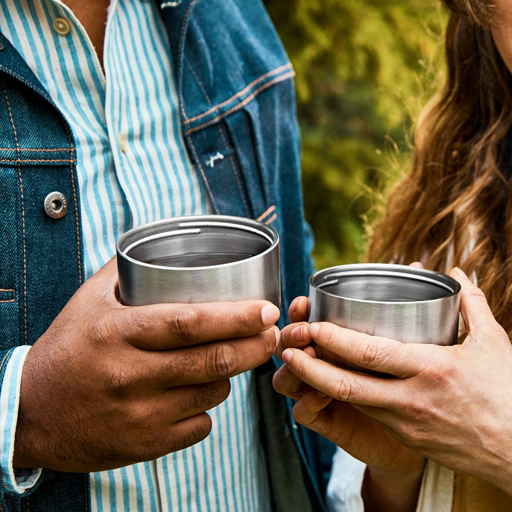 Jede DUO Flasche wird mit zwei doppelwandigen Edelstahlbechern geliefert, die oben und unten aufgeschraubt werden können. Jeder Becher hat ein Fassungsvermögen von 200 ml und ist vollständig kunststofffrei.