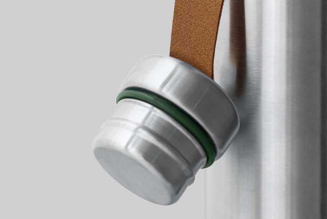 Der Kunstlederriemen sorgt dafür, dass der Deckel nicht verloren geht, und erleichtert das Tragen der Flasche. Er wird sicher an einem Stahlring um den Flaschenhals gehalten.