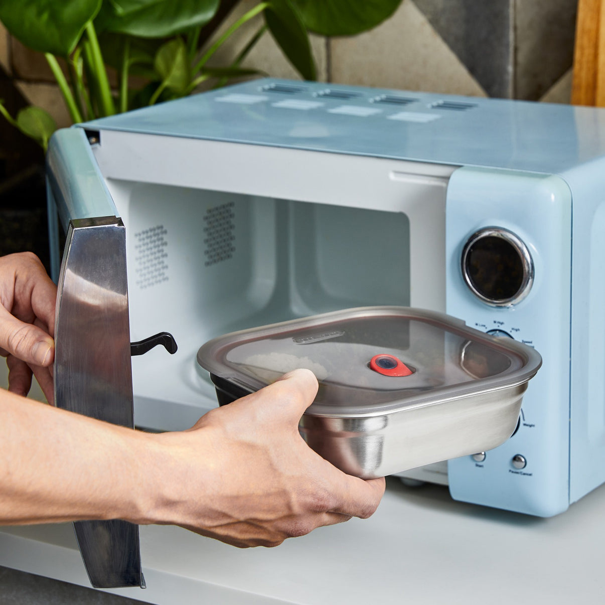 Ja, Sie haben richtig gelesen, diese Stahlboxen sind mikrowellengeeignet. Wir wissen, dass jedem beigebracht wurde, dass Metall nicht in die Mikrowelle gehört, aber das stimmt nur teilweise. Es gibt definitiv einige Metalle, die nicht in die Mikrowelle gehören, aber das gilt nicht für den hochwertigen Edelstahl, den wir verwenden. Diese Art von Stahl und die glatte und abgerundete Form der Stahlboxen sorgen dafür, dass sie keine Funkenbildung verursachen und sicher in der Mikrowelle verwendet werden können. Sie entsprechen extrem hohen Sicherheitsstandards und wurden strengen Tests unterzogen.