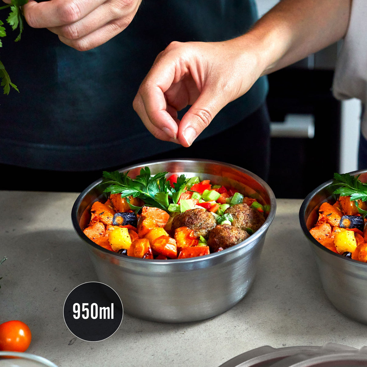 Die Mahlzeitenvorbereitungs-Sets sind spülmaschinenfest (der Deckel ist nur für den oberen Einschub geeignet), gefrierfest und die Stahlbox ist backofenfest (nicht der Deckel). Achten Sie beim Einfrieren darauf, dass Sie nicht zu viel einfüllen, insbesondere wenn Sie Flüssigkeiten vorbereiten, da sich diese beim Einfrieren ausdehnen können.